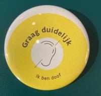 Met deze button kunnen dove mensen aangeven dat ze niet kunnen horen. Door de mondmaskers kunnen ze niet meer liplezen, dus een button kan veel duidelijk maken.